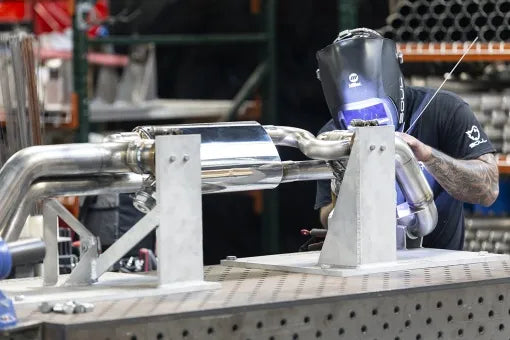 CONSTRUCTION: Each system is made from mandrel bent .060″ wall T304L stainless steel tubing, CNC machined flanges, and laser cut brackets. Back purged TIG welding (with ARCAL™ Prime argon gas) ensures proper weld penetration and longevity. Water jet cut flanges are made to ISO 9001:2015 standards with tolerances of +/- 0.003 inches for extreme precision. We fabricate each exhaust using thick gauge aluminum fixtures which act as a great heat sink during the welding process and prevent warping not only of our products, but the fixtures themselves to ensure perfect fitment.