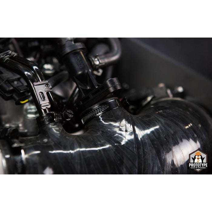 For starters, we ditched the turbulence generating, accordion-styled intake hose and replaced it with 5 layers of silicone embedded with heat-resistant fibers. Our new and improved hose is also reinforced with steel wire ensuring that it keeps its shape even under the impressive boost the K20C1 puts out. On top of strengthening the intake boot, We've also made sure to increase the diameter and smooth out the interior which greatly assists the overall 42-percent increase in flow throughout the full system.